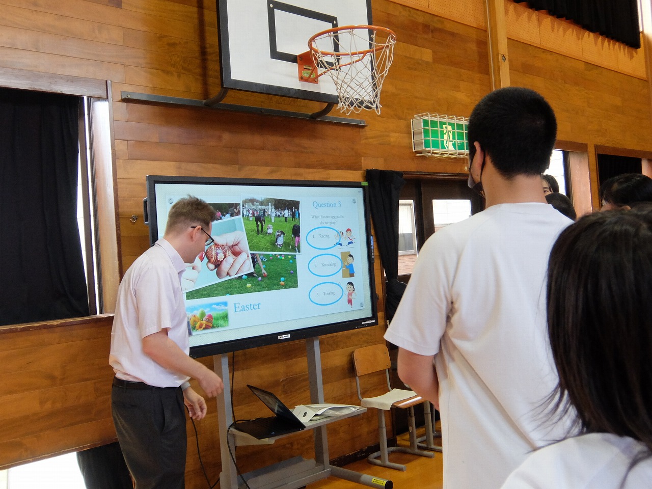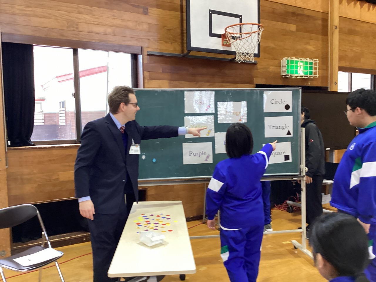 | ショーン先生を招いての English Class を行いました。アメリカの祝日についてクイズに挑戦しました。「えー、日本と違う!」のように日本との違いに驚きました。次回はハロウィンの勉強に挑戦します。 |