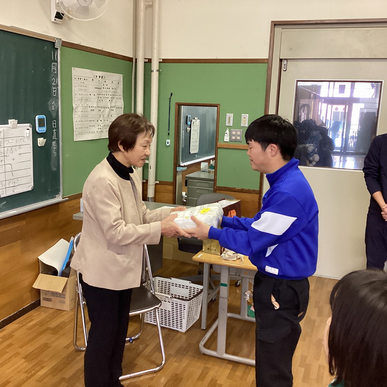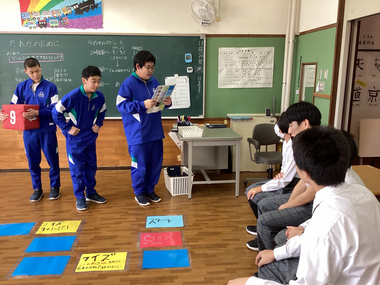| 中学部1・2年生の主催で3年生を送る会をやりました。お楽しみでは「アタックチャンス」でおなじみのクイズ番組、プレゼントは手作りの木箱を渡しました。和やかな良い会になりました。 |