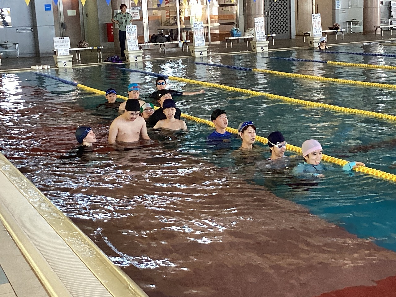 | 北秋田市民プールで水泳教室を行いました。水中に潜る、バタ足で頑張る等、それぞれ決めた目標にチャレンジしました。時間ギリギリまで、意欲的に取り組んでいました。 |
