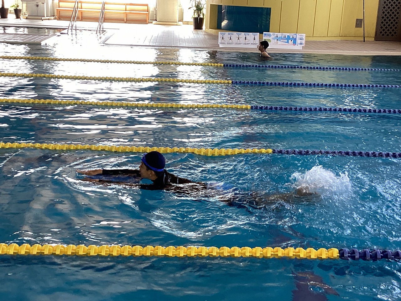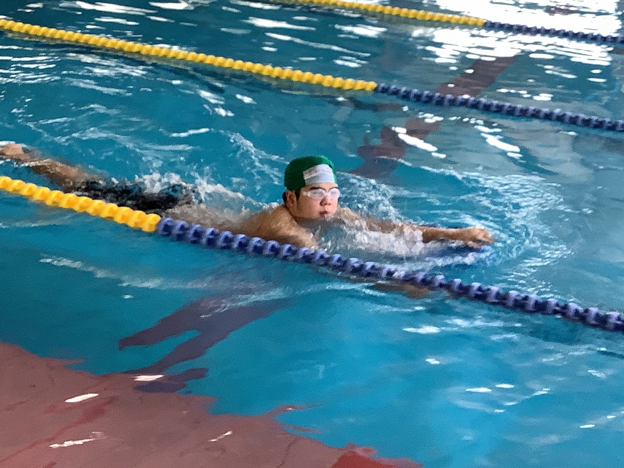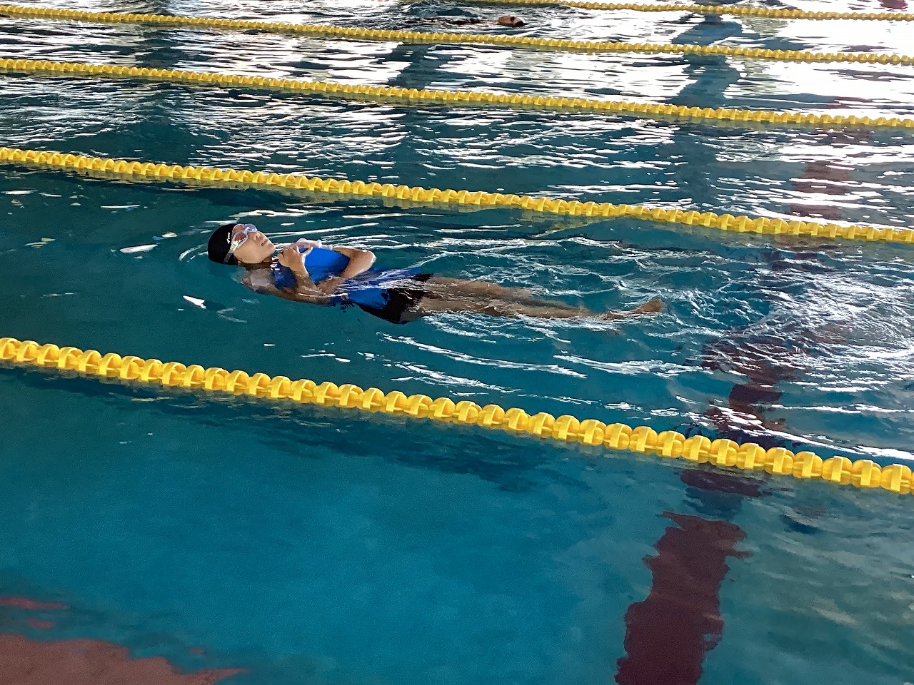 | 北秋田市民プールで2回目の水泳教室を行いました。けのびやバタ足、背泳ぎなど一人一人が決めた目標を達成するために、時間いっぱいチャレンジしました。 |