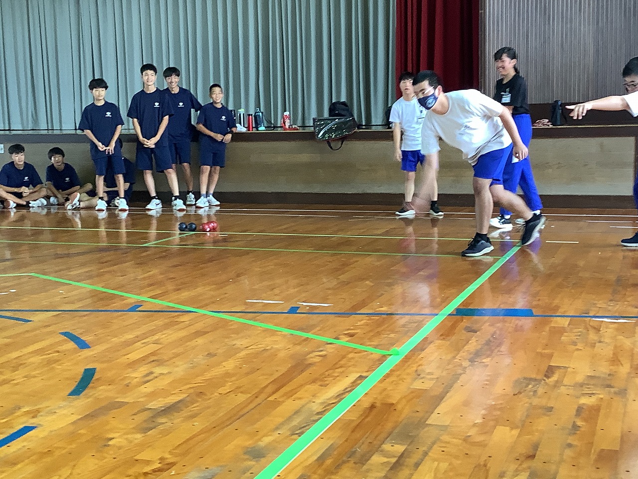 | 鷹巣中学校2年生とボッチャ交流を行いました。ボッチャを通して、互いにアドバイスしたり励まし合ったりする様子が見られました。。よくねらってボールを投げたり相手のボールをはじいたりなど、作戦を工夫して熱い戦いを繰り広げました。 |