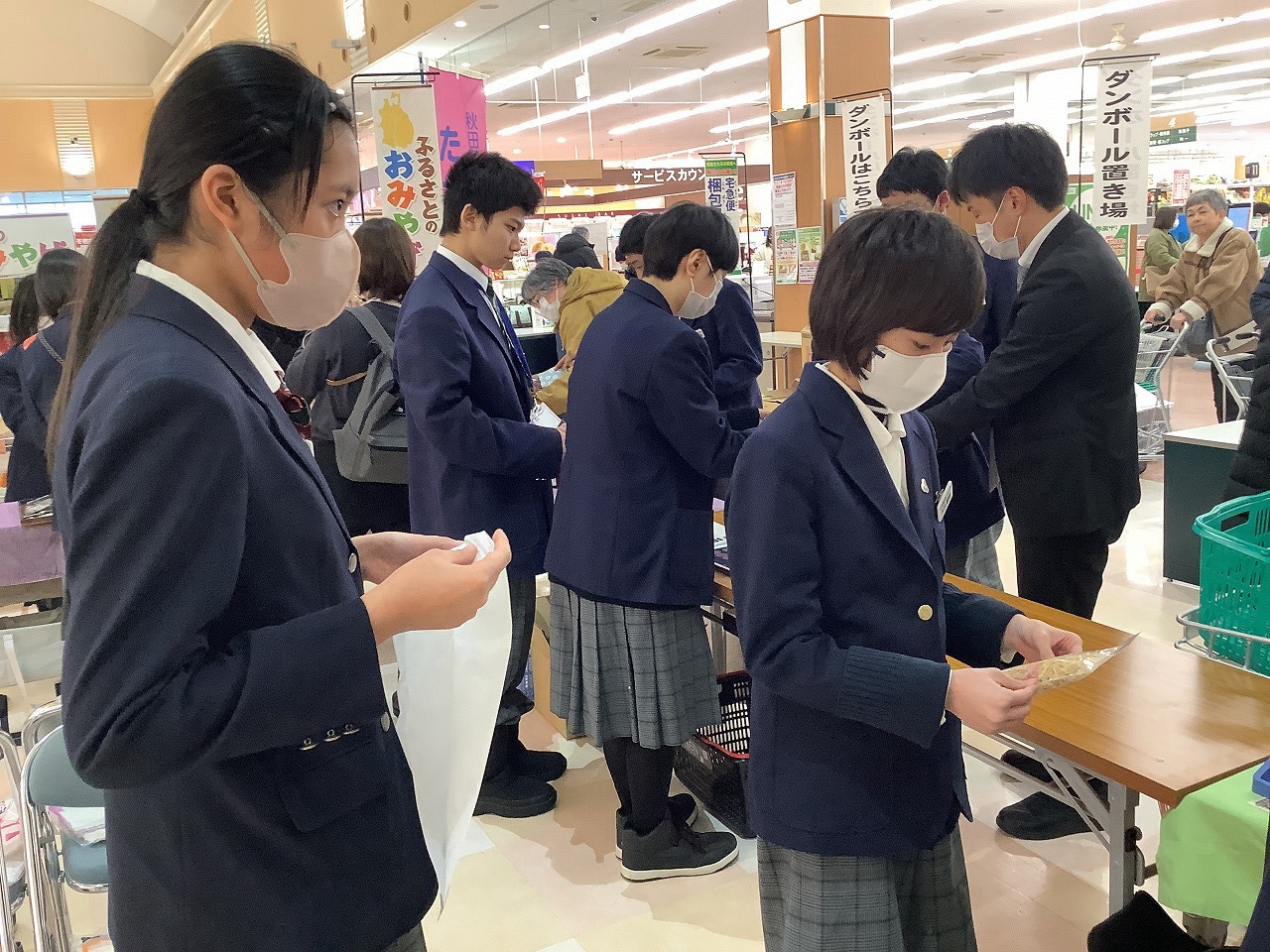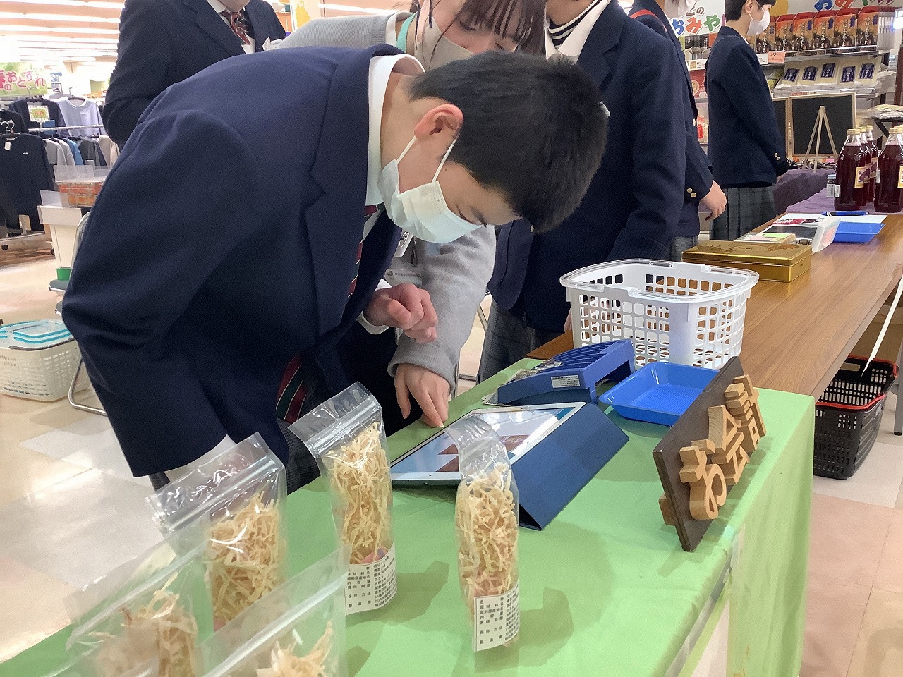 | いとく鷹巣ショッピングセンターで販売会を行いました。10:15~11:15の1時間、自分たちが作った製品を販売しました。経験したことのない役割に挑戦し、レジ打ちや袋詰め、商品説明など緊張しながらも頑張りました。 |