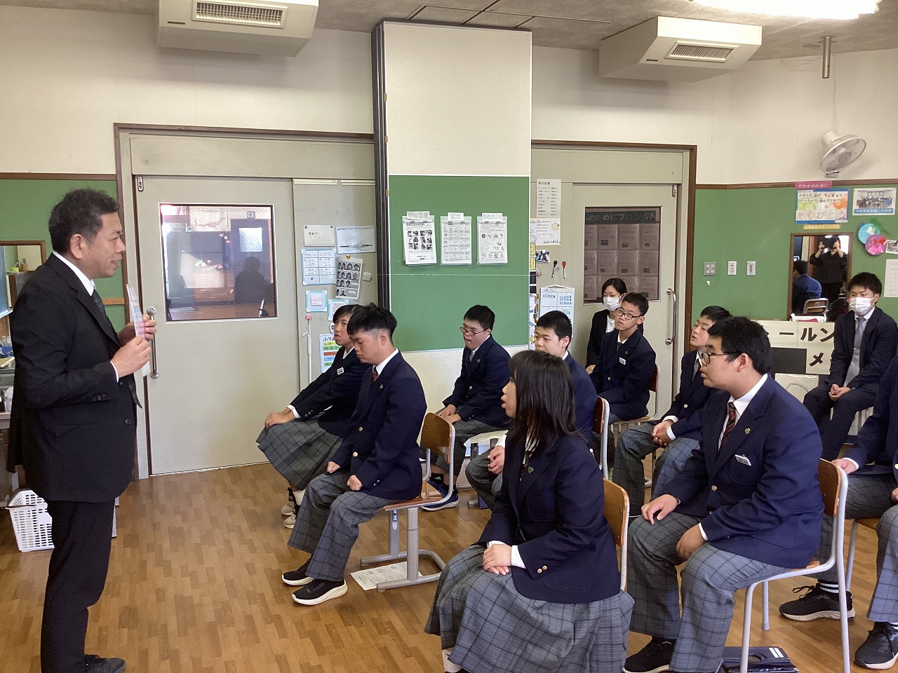 | 後期実習に向け、結団式を行いました。進路指導主事や学部主事の話を聞いたり、実習に向けた目標を発表したりする中で、一人一人実習への気持ちを高めていました。 |