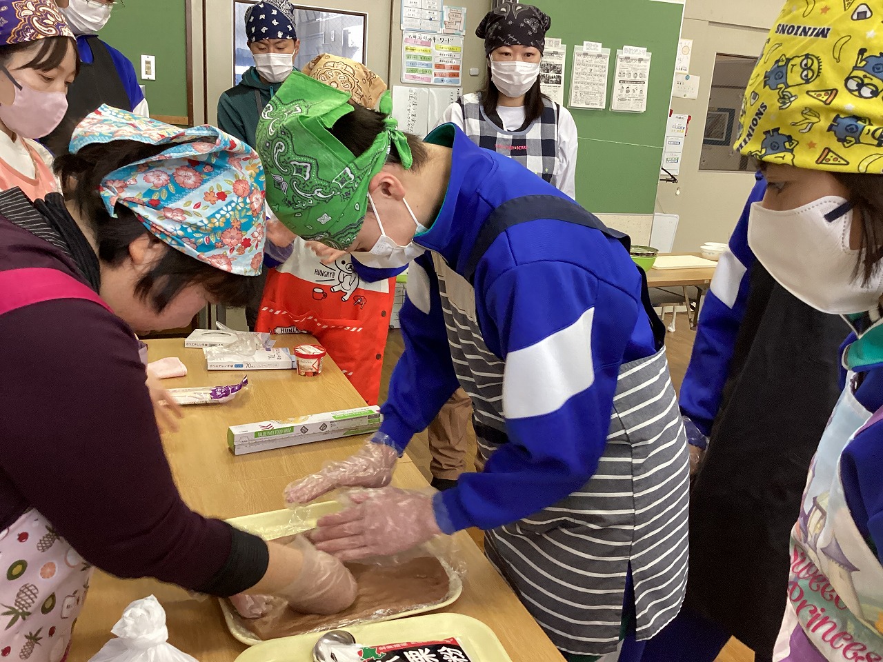 | 北秋田市民ふれあいプラザコムコムの調理室で地域の料理学習を行いました。今年度も戸沢先生に教えていただきながらだまこ鍋を作り、みんなで会食を楽しみました。「おいしい!」の越えがあふれ、大成功でした。 |