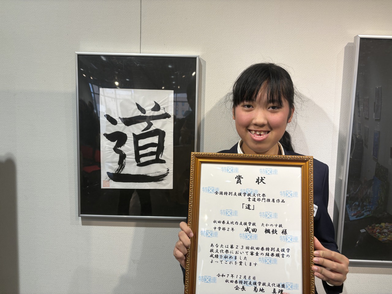 | 秋田市のにぎわい交流館AUでわくわく美術展の表彰式が行われました。書道部門で全国展へ推薦作品に選ばれた中学部2年生の女子生徒が参加しました。緊張の面持ちでしたが式の後は満面の笑顔でした。 |