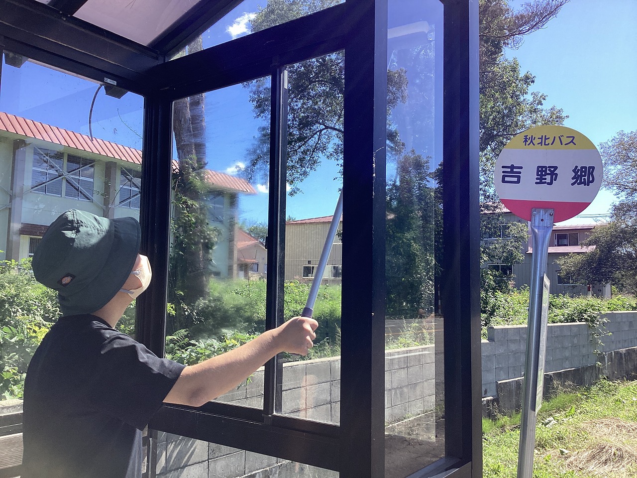 | 吉野郷バス停の清掃を行いました。地域の方々がバス停を気持ちよく利用することができるよう、掃き掃除、窓拭き、ごみ拾いをしました。きれいになったバス停をみて「きれいになった!よかった!」と感動する3名の姿が見られました。 |