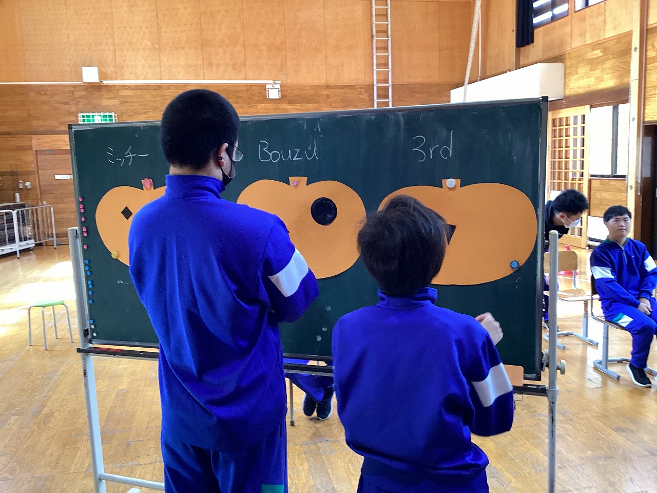 | 新入生を迎え、対面式を行いました。新入生が楽しむことができるお楽しみコーナーの企画を考えました。ボッチャ&カーリング、イントロクイズを一緒に楽しむ中で、新入生も笑顔いっぱいの会となりました。 |
