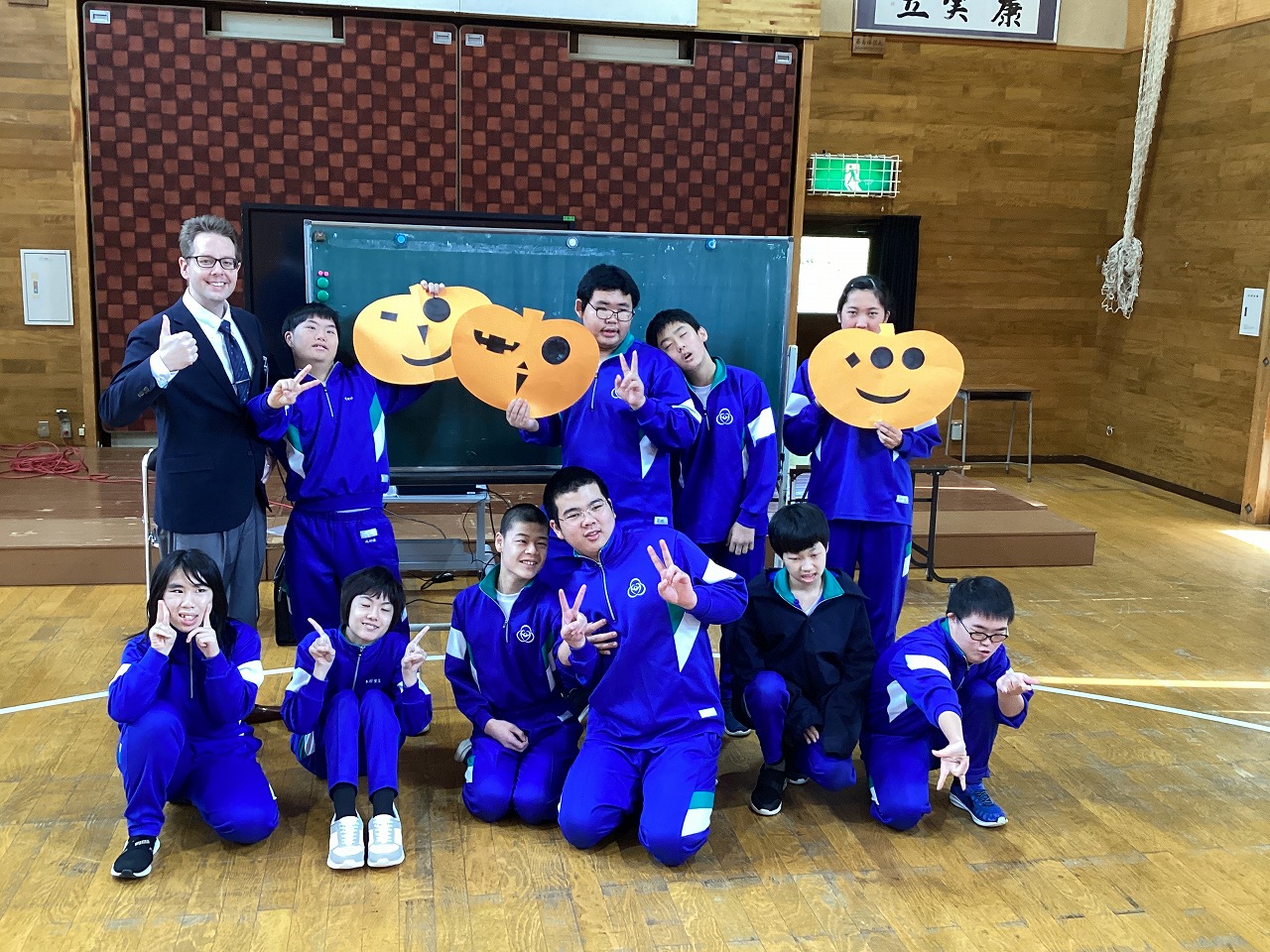 | ショーン先生に来ていただき、English Classを行いました。今回のテーマは「ハロウィーン」と「形」。ショーン先生に自分の欲しい形を伝えて、チーム毎にジャックオランタンを作りました。 |