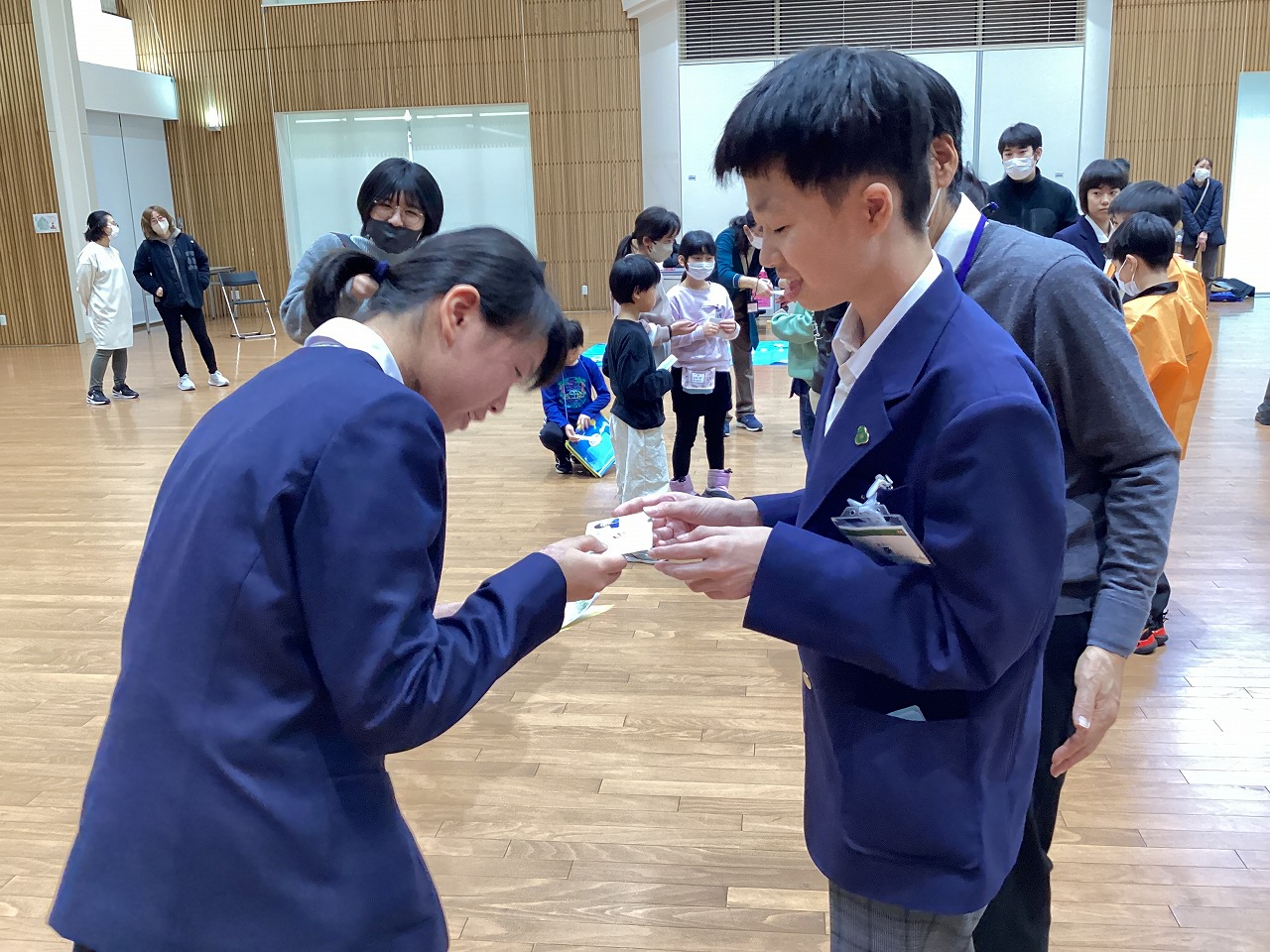 | 北秋田市ふれあいプラザコムコムで行われた北秋田地区の特別支援学級との交流会である「なかよし交流会」に中学部1・3年生が参加しました。名刺交換や各校で準備したコーナー遊びを通して仲良くなりました。「ばたもっち」や「ないりっくん」などの北秋田市のキャラクターをモチーフにしたたかのす校の「きたキャラ的当て」も大盛り上がりでした! |
