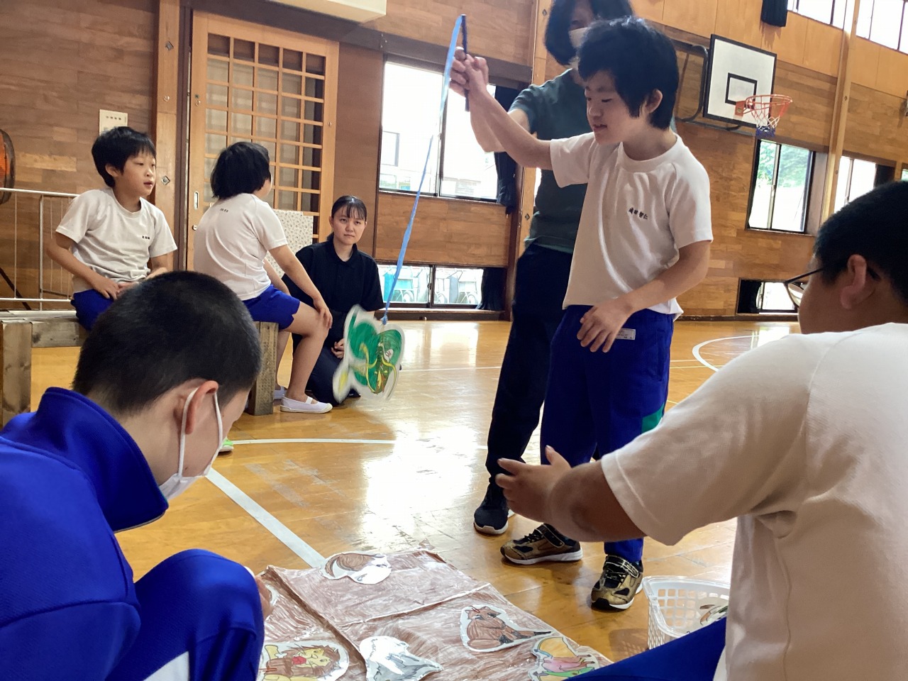 | 6月の登山学習・宿泊学習に向けて、比内支援学校の本分校での交流をしました。当日の日程やグループを確認したり、レクリエーションで親睦を深めたりしました。 |