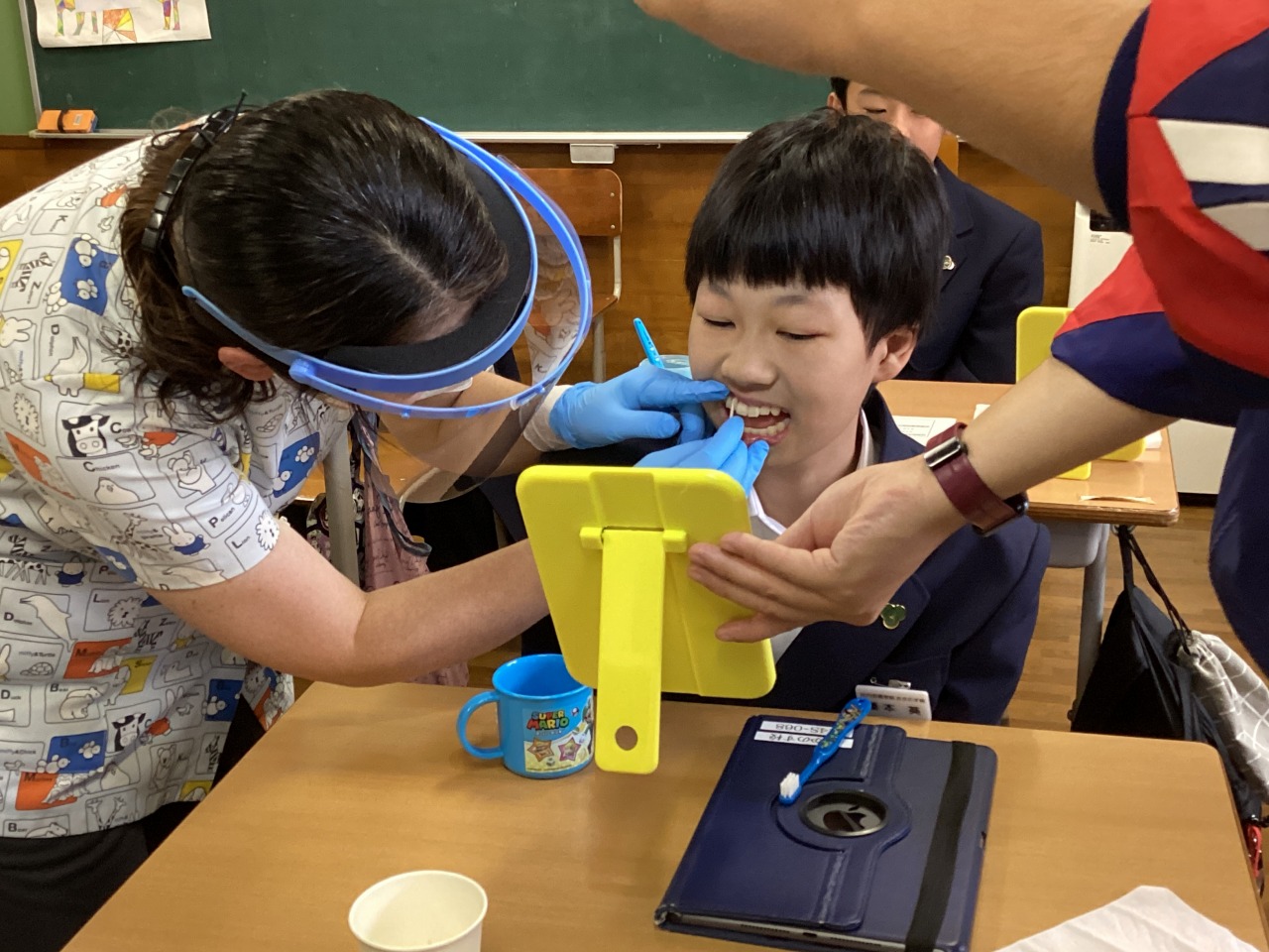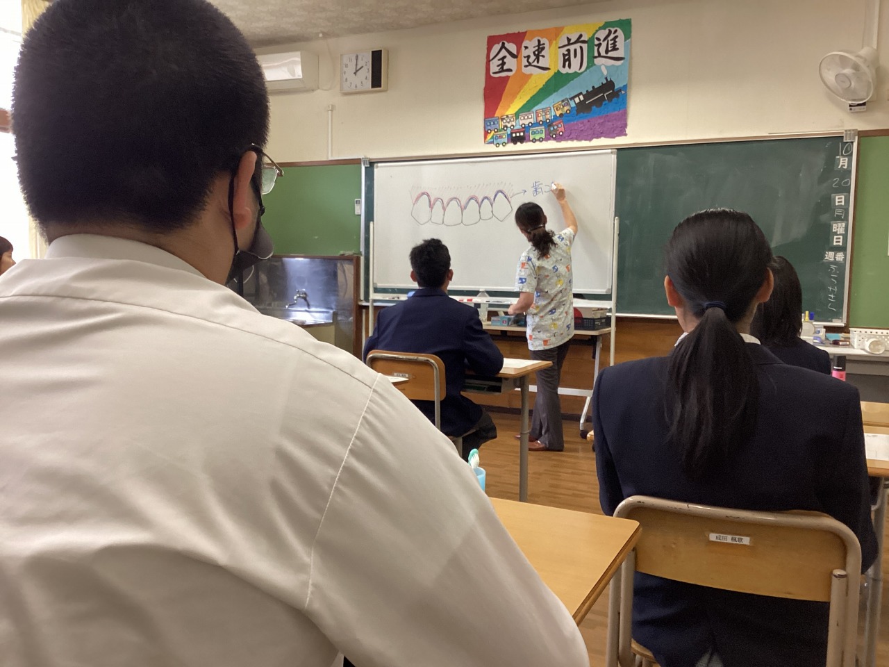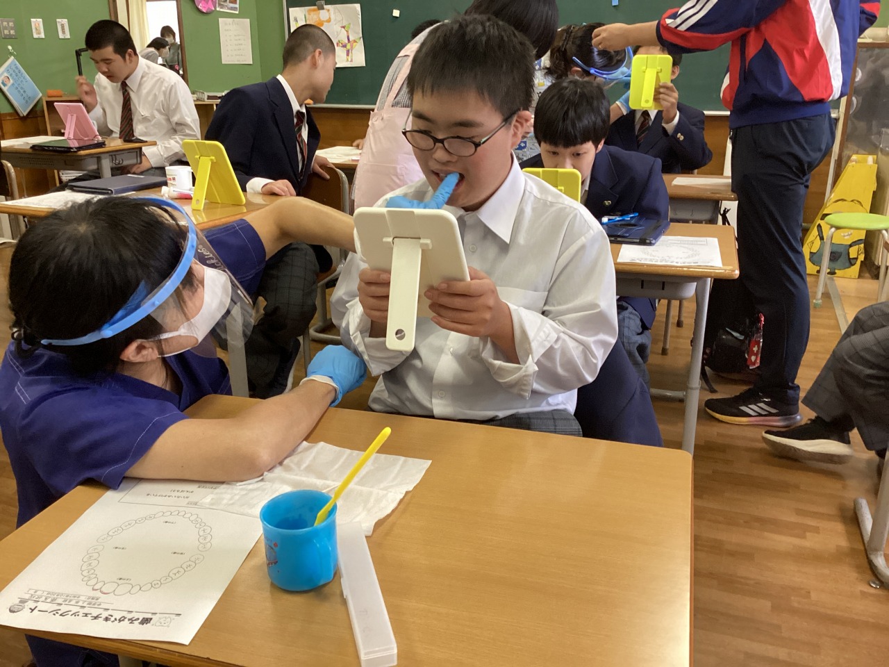 | 学校歯科医の小松先生と歯科衛生士の松橋さんにきていただき、歯磨きについて指導してもらいました。実際に歯垢を見せてもらい、生徒から「え..」や「汚い」などの反応がありました。毎日の歯磨きを頑張りました。 |