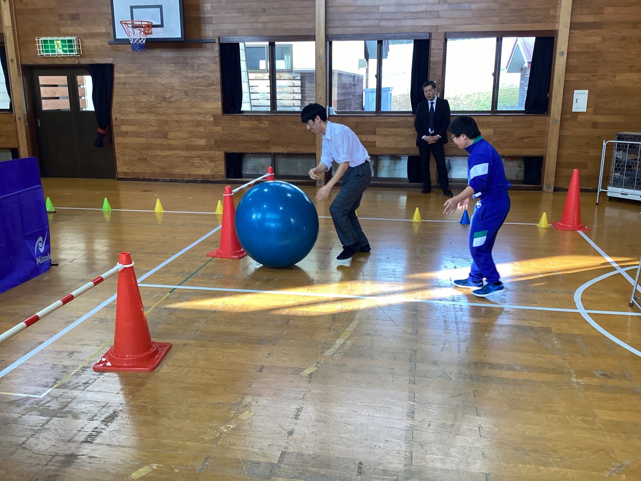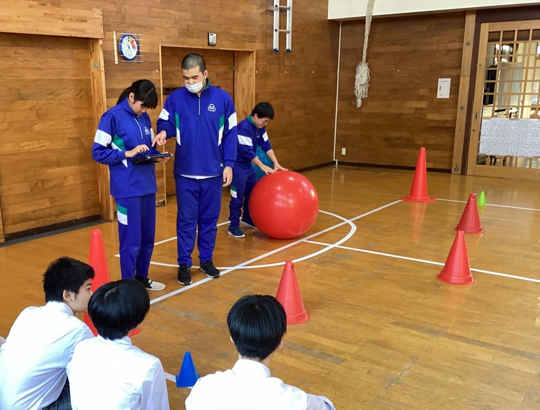 | 中学部遊競技では、今年、開催されている2025大阪・関西万博に合わせて、「2025たかのす万博」を行いました。2人で協力しながら紐付きドローンを操作し、球体を運ぶことに挑戦しました。最後にみんなでダンスを披露し、運動会を盛り上げまし |