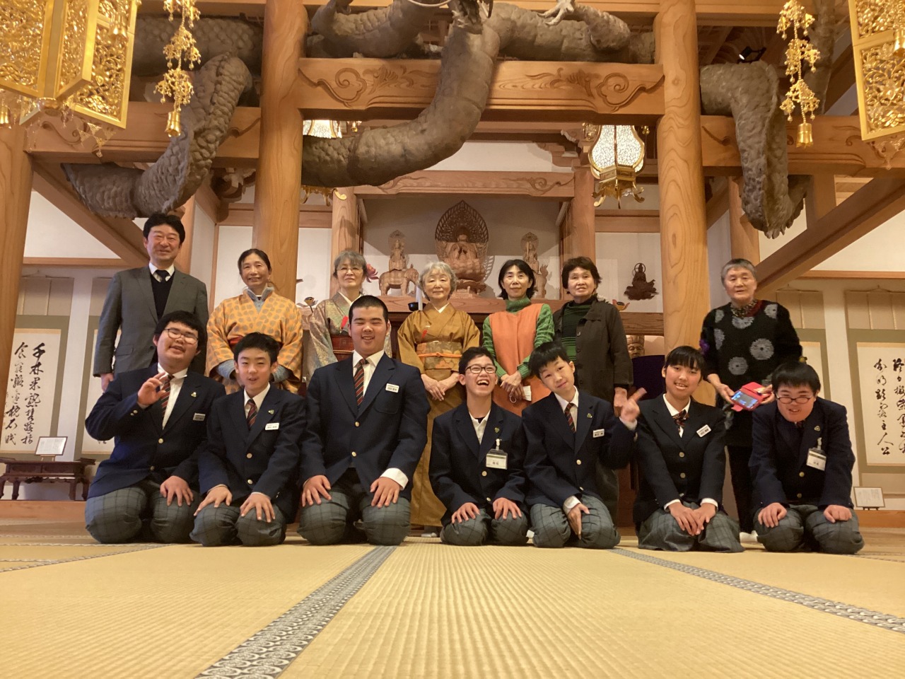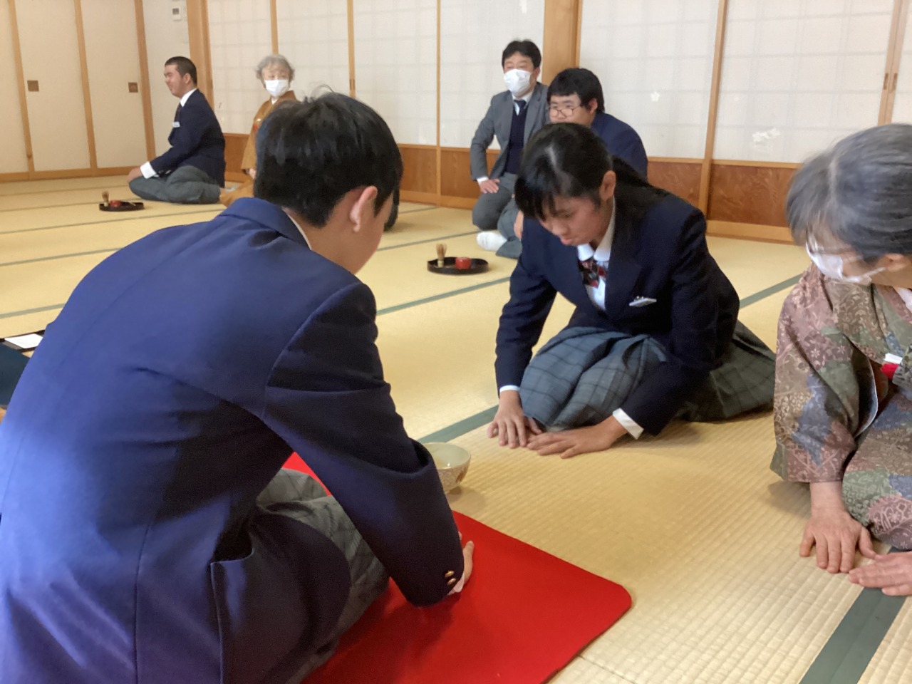 | 七日市にある龍泉寺でお茶体験をしてきました。淡交会の方からお茶の作法について教えていただき、言葉遣いや礼の仕方など「おもてなしの心」を感じることができました。 |