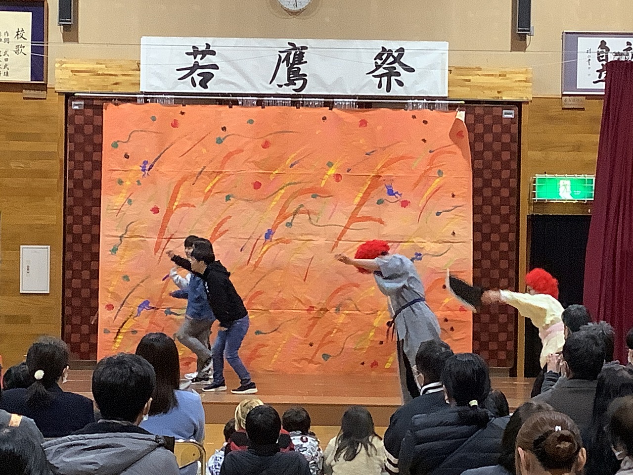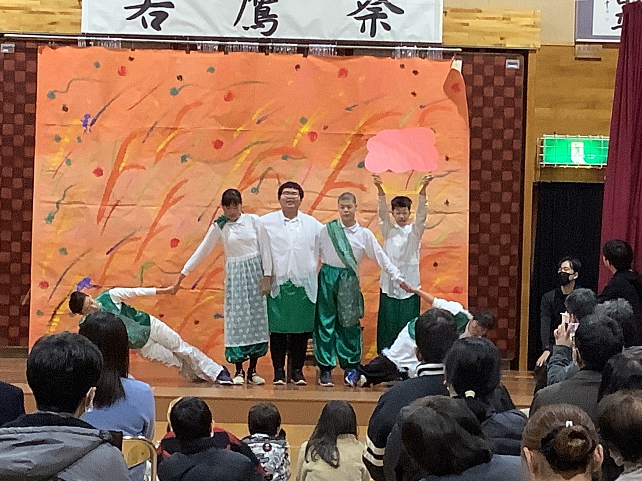 | 今年度はミュージカル「三枚のお札」に挑戦しました。セリフやダンスのほか、秋の山の風景やこどもを追いかける鬼婆を阻む川や山を組体操で表現しました。 |