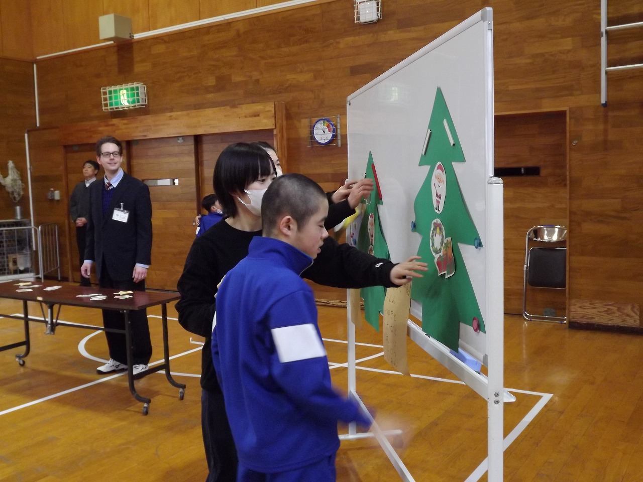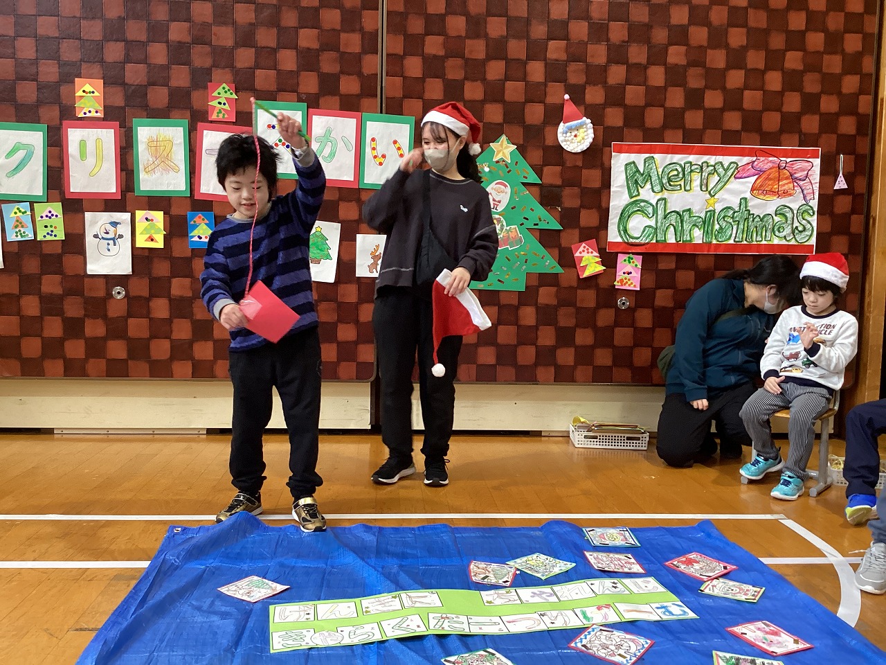今年度最後のイングリッシュ・クラスでは、ショーン先生と楽しく動物のジェスチャーをしながら英語に親しみました。クリスマスのお話を聞き、サンタやトナカイ、靴下などの英単語を教えてもらいながら、イラストを貼ってクリスマスツリーを作りました。