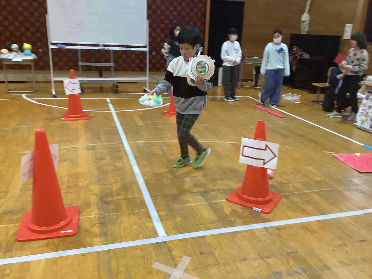 | 5月26日(月)運動会では、小学部遊競技「ジャングルぐるぐる大脱出!」を行いました。ジャングルに迷いこんだ小学部生たちが、川や蛇などの障害物を越え、ペアの友達とジャングルキングのゴリラへ果物を届け、全員無事ジャングルを脱出することができました。 |