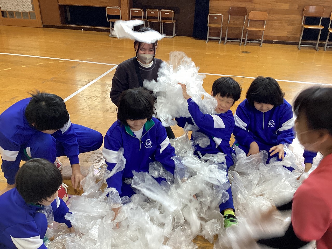 | 小学部では、今年度も成田先生をお迎えして、ミュージックケアを行いました。音楽に合わせて鳴子を鳴らす活動やビニール袋を飛ばす活動、バルーンでの表現活動を楽しみました。 |