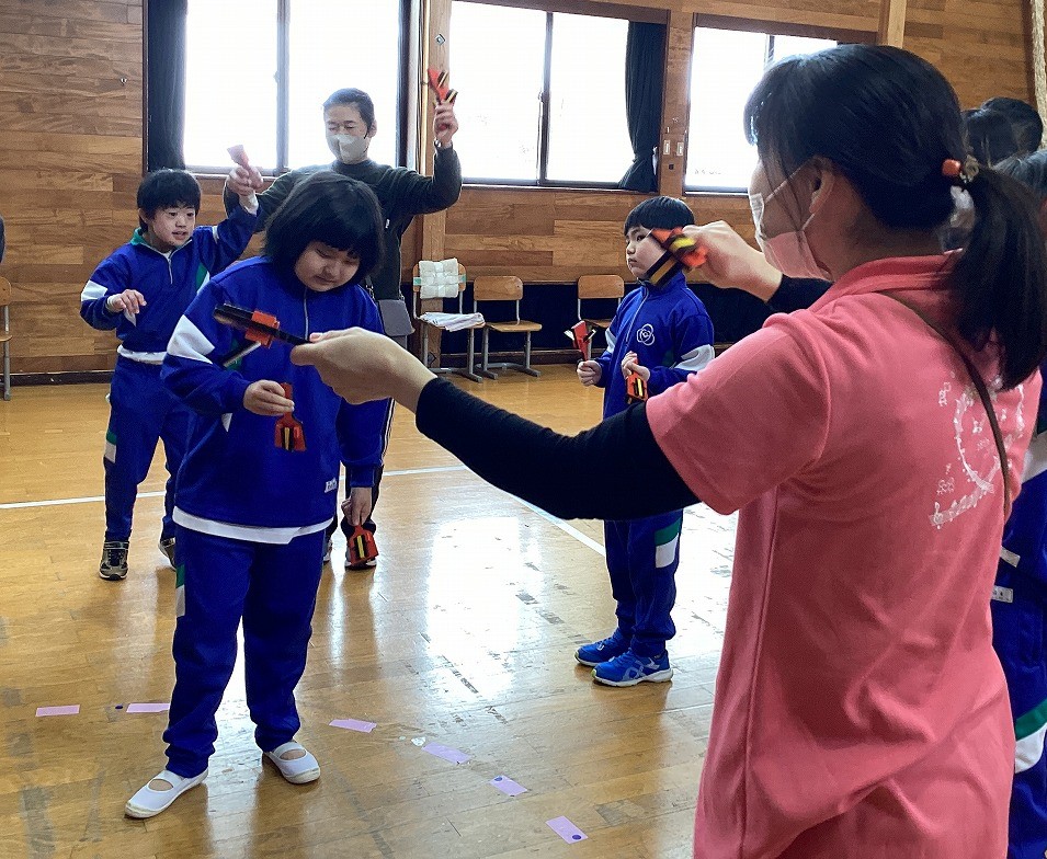 清鷹小学校4年生との交流では、「フラフープわくぐり」「たたいてポン」「玉入れ」の3つのゲームを一緒に楽しみました。