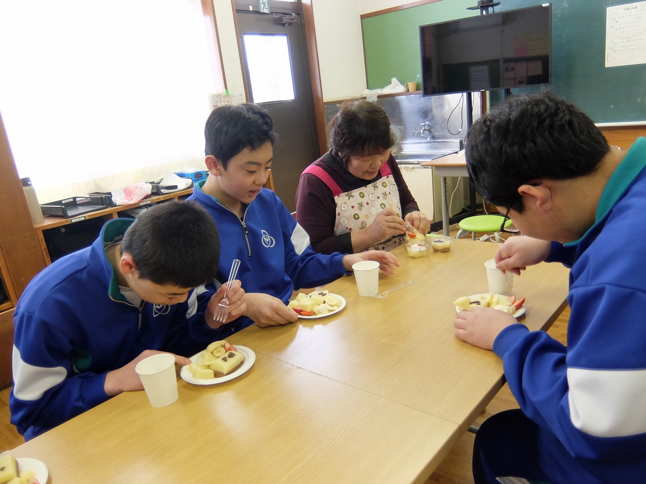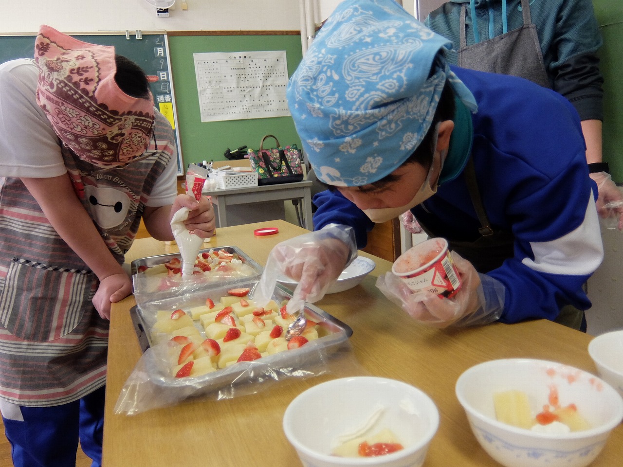 | 地域の料理2回目は戸沢先生にバター餅の作り方を教えていただきました。黄色い大きなバター餅ができ、大歓声が上がりました。3グループに分かれてフルーツやクリーム、チョコレートをトッピングし、オリジナルバター餅に仕上げ、そのおいしさをみんあで味わいました。 |
