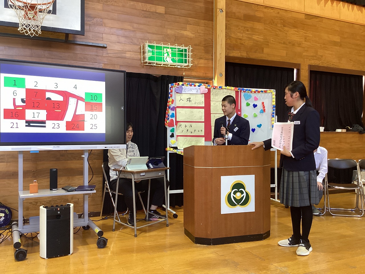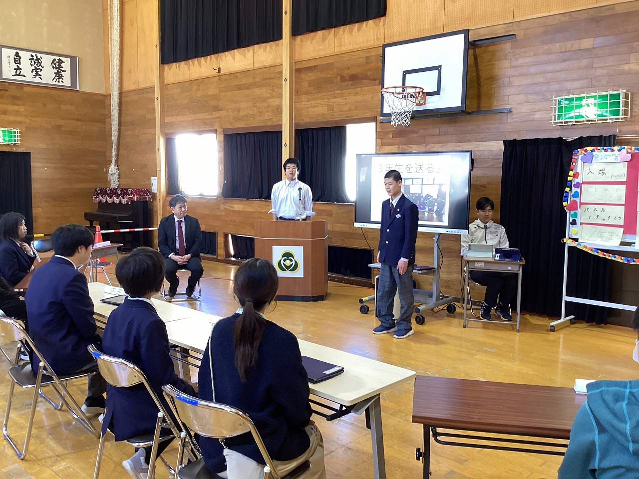 | 中学部1・2年生の主催で3年生を送る会をやりました。お楽しみでは「アタックチャンス」でおなじみのクイズ番組、プレゼントは手作りの木箱を渡しました。和やかな良い会になりました。 |