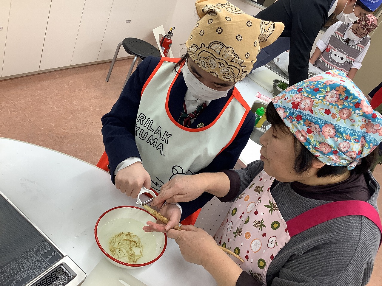 | 北秋田市民ふれあいプラザコムコムの調理室で地域の料理学習を行いました。今年度も戸沢先生に教えていただきながらだまこ鍋を作り、みんなで会食を楽しみました。「おいしい!」の越えがあふれ、大成功でした。 |