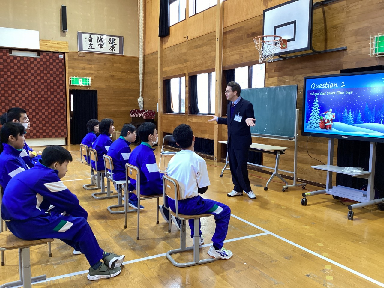 | ショーン先生を招いての English Class を行いました。アメリカの祝日についてクイズに挑戦しました。「えー、日本と違う!」のように日本との違いに驚きました。次回はハロウィンの勉強に挑戦します。 |