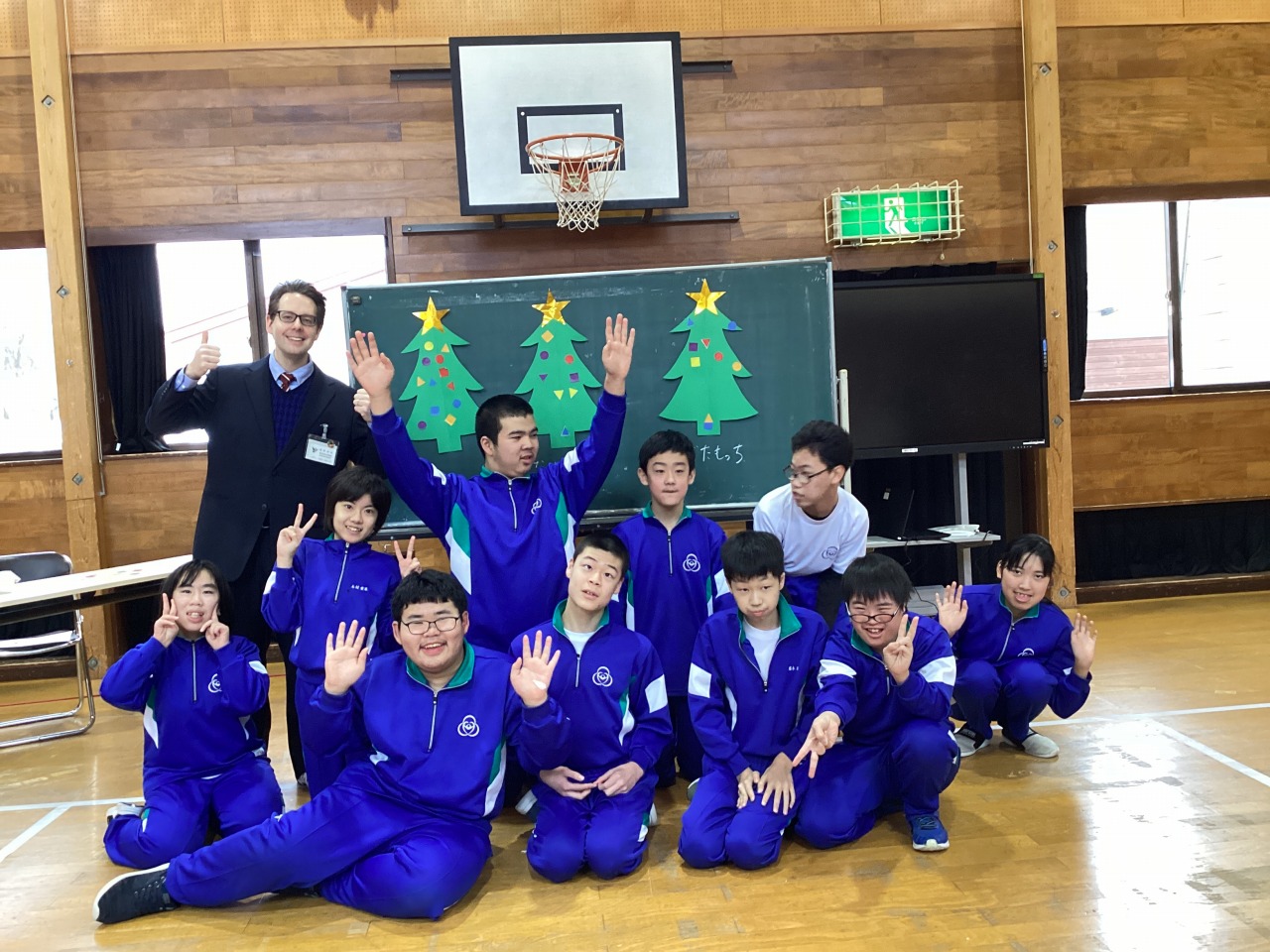 | ショーン先生と一緒に English Classをしました。クリスマスのクイズで、アメリカのツリーの大きさに驚いたり、英語で色や形を伝えてもらったオーナメントでツリーを彩ったりして楽しみました。 |