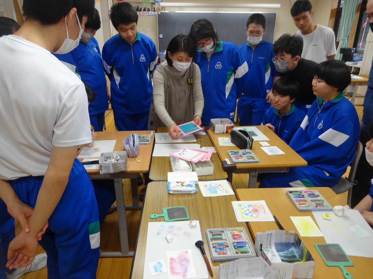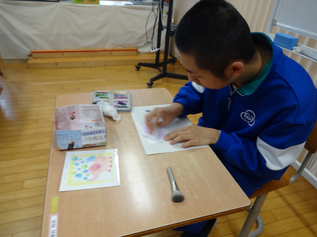 | 高等部で和アートが開催され、パステルで動物の「象」をテーマにした絵を描きました。パステルをこすって色を塗り、思い思いのパステルアートを完成させました。完成した友達の作品を見て「かわいい!」「色合いが素敵!」などの感想を話していました。 |