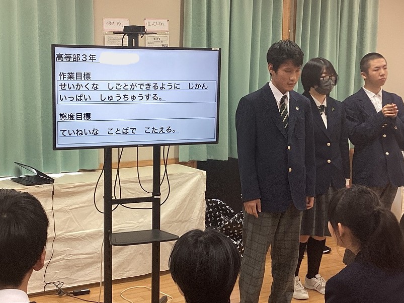 | 高等部3年生が後期実習報告会を行いました。実習を終え、「卒業後も毎日元気に働けるように体調管理を今から頑張りたい」「日頃から周りとコミュニケーションをとっていきたい」など卒業までに頑張りたいことを発表しました。 |