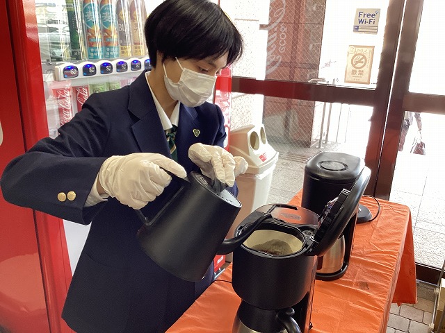 | 高等部1・2年生が2回目の外部講師による絆カフェの指導を受けました。9月に教えてもらったコーヒーの蒸らし方を生かし、淹れたコーヒーを飲んでもらいました。「おいしい!蒸らしもできている」と感想をもらい、出店へ自信を付けました。 |
