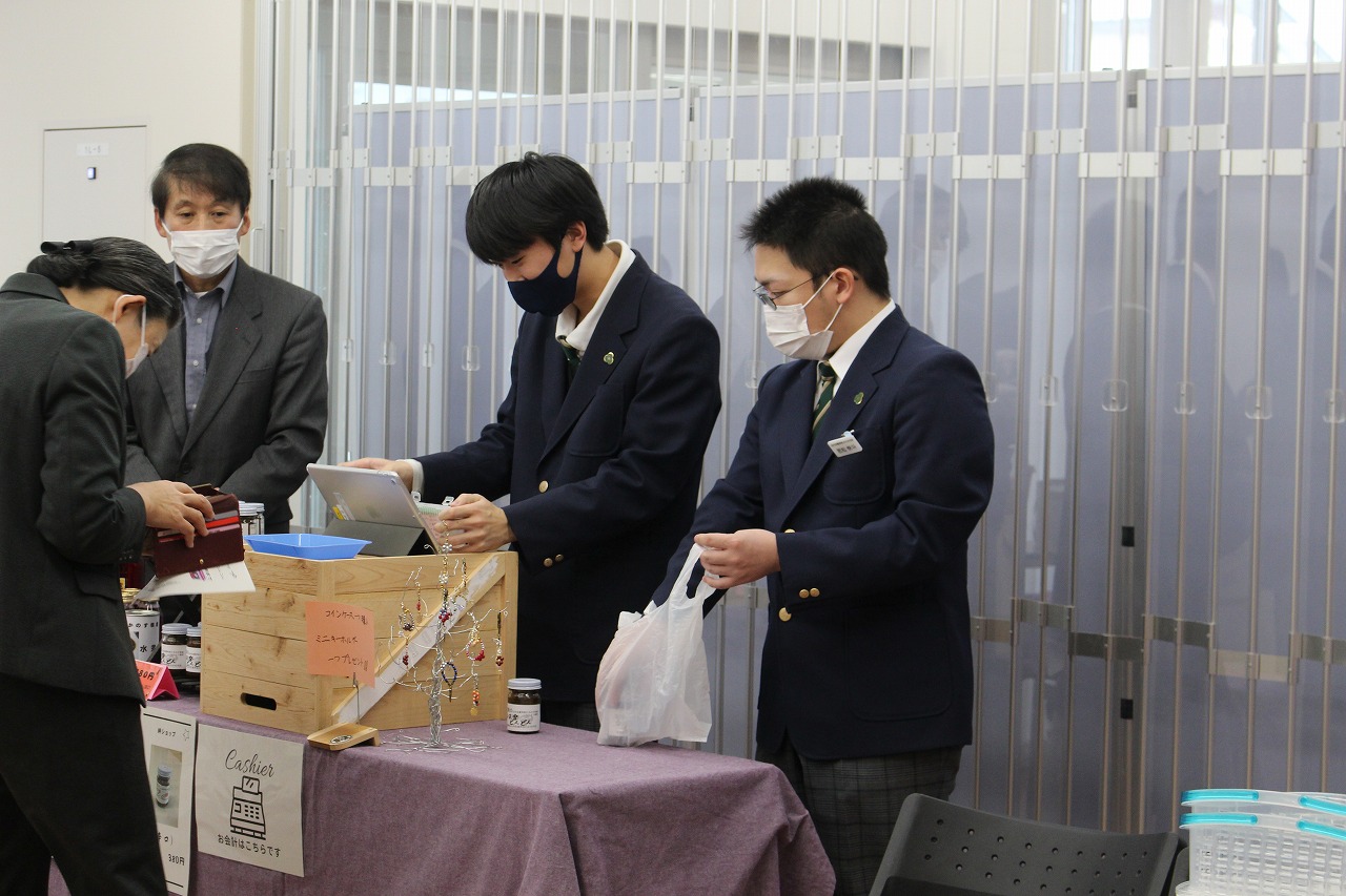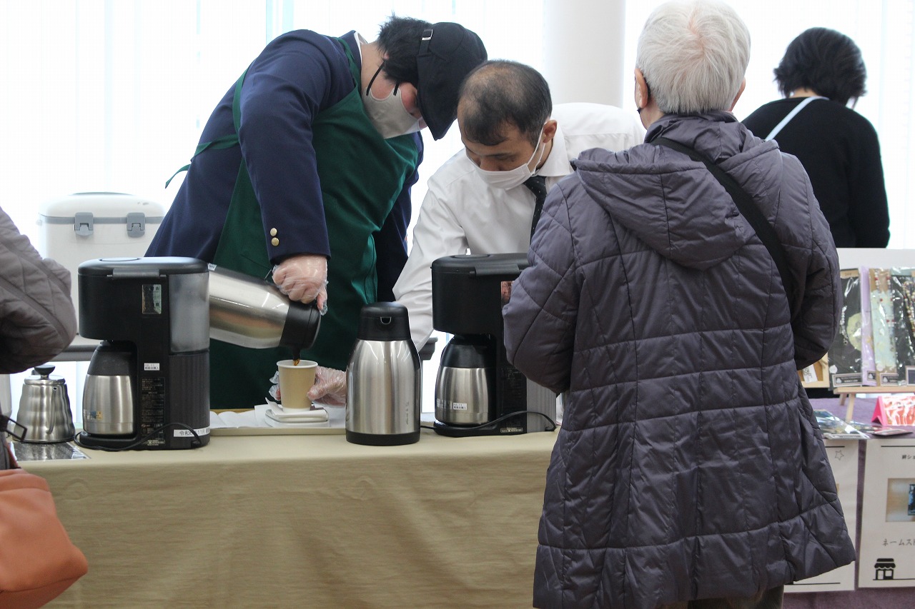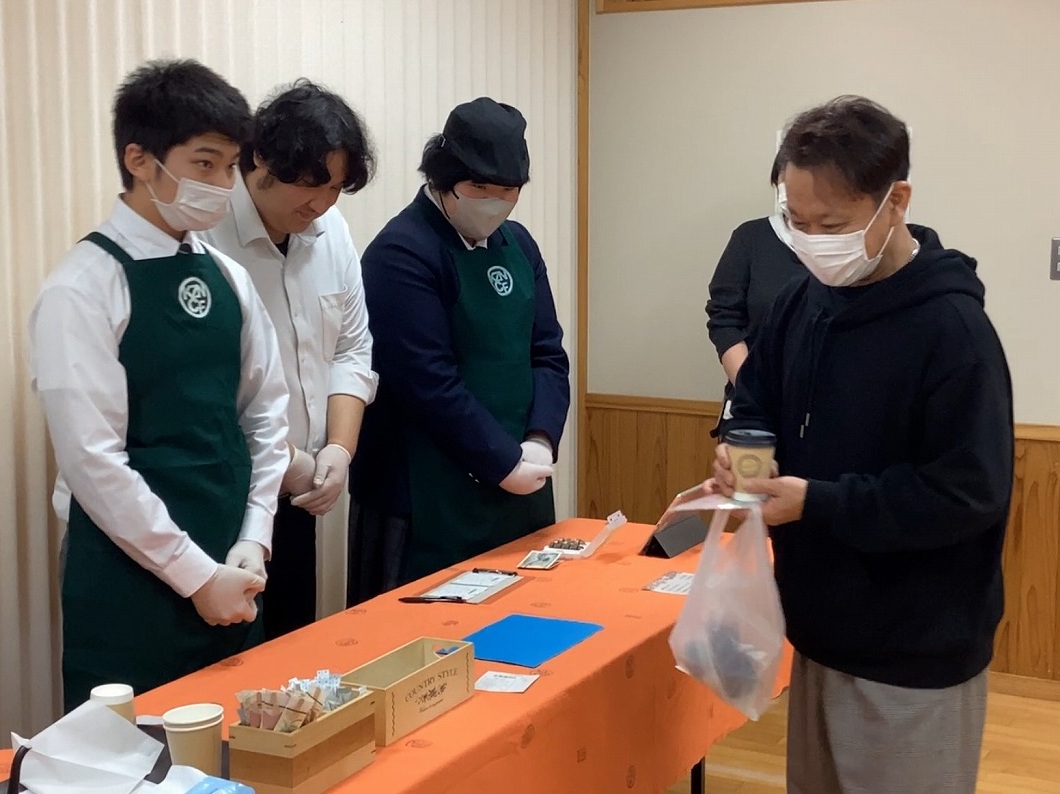 | 北秋田地域振興局で予定していた絆カフェ・ショップでしたが、感染症拡大への対応により、校内で「ミニ絆カフェ・ショップ」として開催しました。これまでの準備の成果にを発揮し、校内の職員や生徒にコーヒーや作業学習製品を販売しました。 |