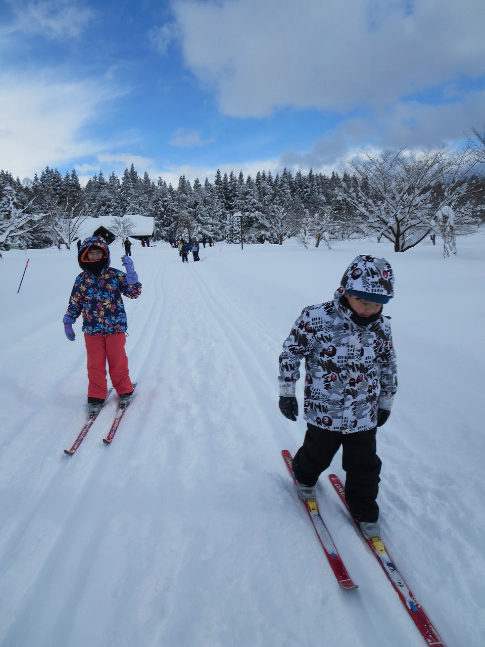 北欧の杜公園でスキー教室を行いました。大コース、小コースに分かれて、スキーを滑らせながらたくさん歩くことができました。今年度も地域の先生の梅井先生と一緒にスキーを楽しみました。