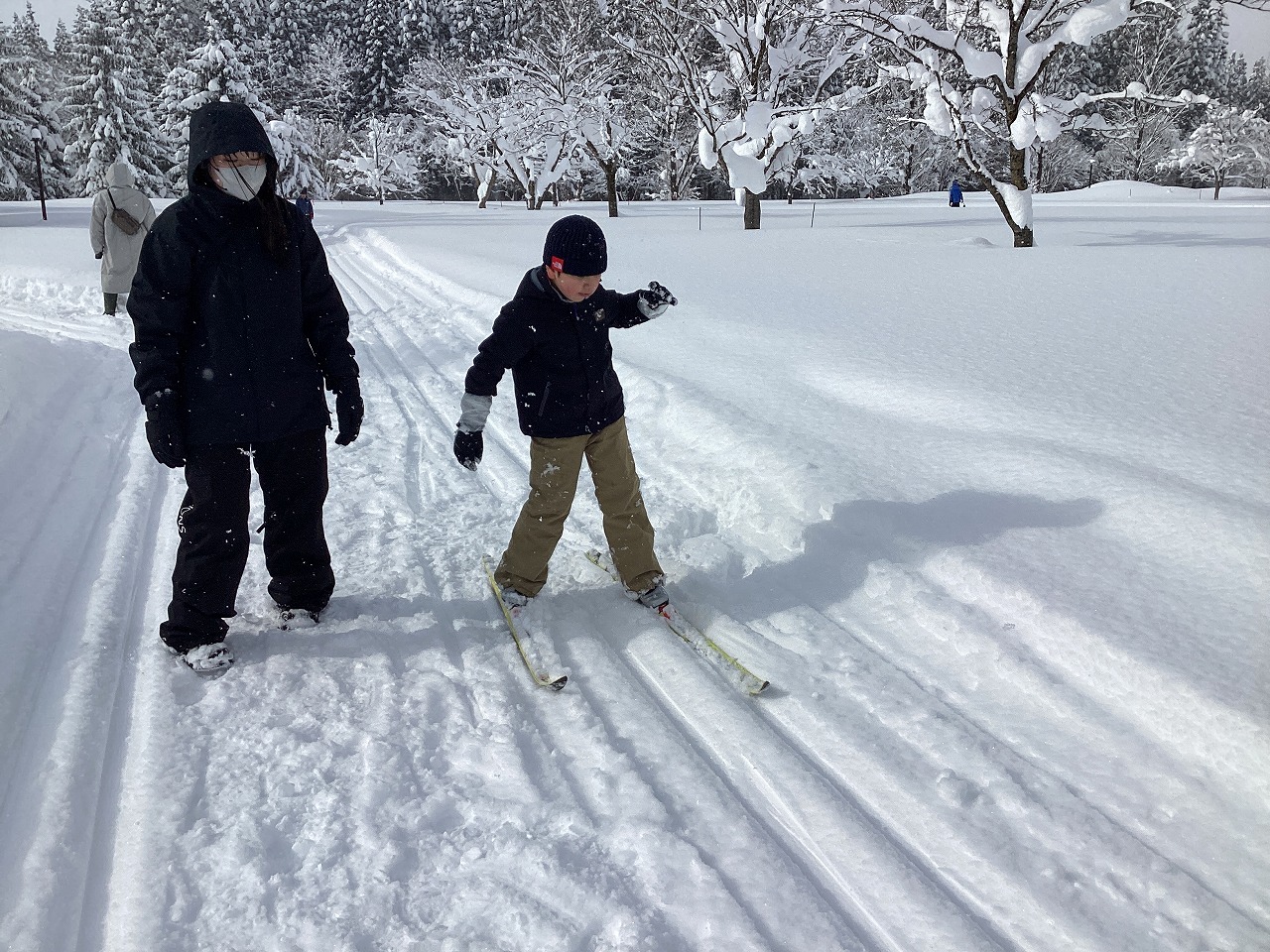 北欧の杜公園でスキー教室の2回目を実施しました。大コースと小コースに分かれて自分の目標達成を目指して時間いっぱいスキーで歩くことができました。